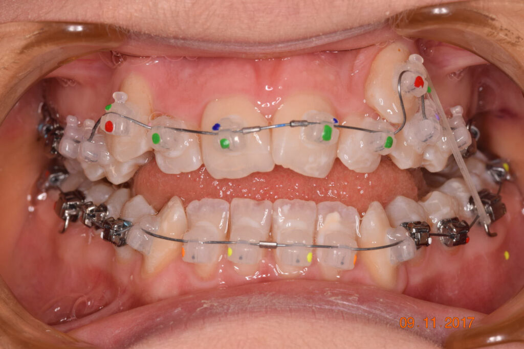 The treatment began in 2017. Given the patient’s preference for less visible brackets, Damon Clear brackets were selected. High torque upper cuspids and low torque upper incisors were chosen to offer the best torque control for upper arch development. For the lower arch, there were no alternative bracket configurations available. Bite turbos were applied to the upper second molars.